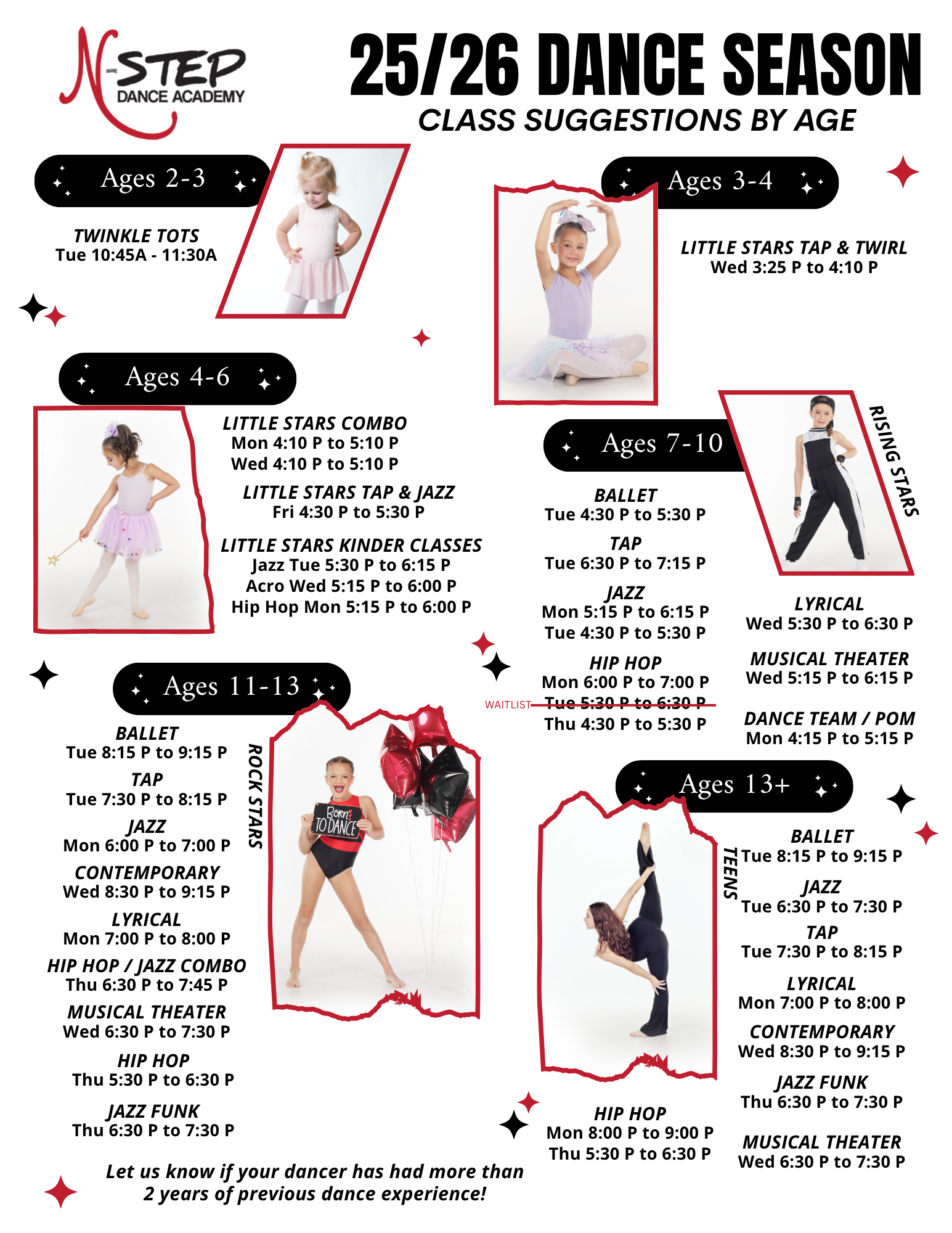 Our classes are ordered by age group and style. Students are placed in age/skill leveled classes by the Artistic Director.